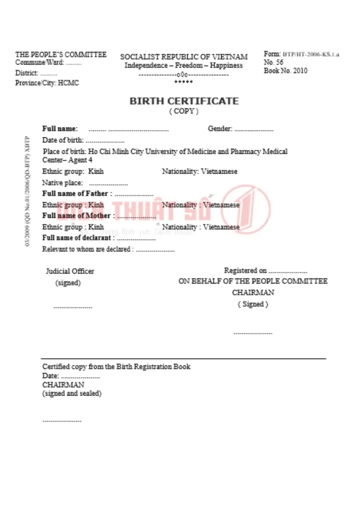 Dưới đây là mẫu dịch giấy khai sinh tiếng Anh thường được sử dụng: