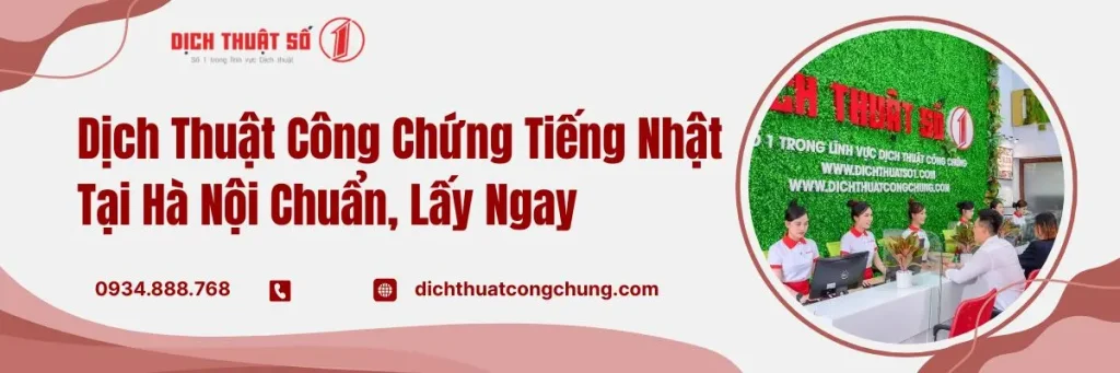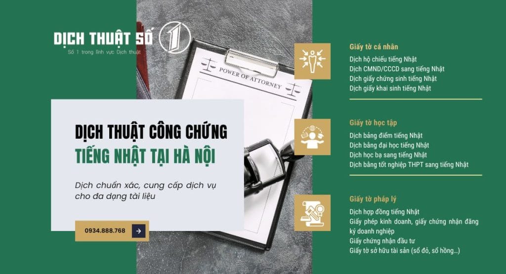 Tại Hà Nội, dịch vụ dịch thuật công chứng tiếng Nhật ngày càng trở thành nhu cầu quan trọng, hỗ trợ cá nhân, doanh nghiệp và tổ chức trong các giao dịch, học tập và hợp tác với đối tác Nhật Bản. Nếu bạn đang tìm kiếm địa chỉ văn phòng dịch thuật công chứng tiếng Nhật tại Hà Nội tốt nhất, giá cả cạnh tranh, chất lượng hàng đầu, liên hệ ngay Dịch Thuật Công Chứng Số 1 qua thông tin: