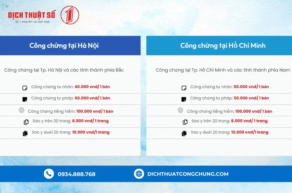 Giá công chứng tiếng Đức tại Hà Nội và TPHCM như sau: