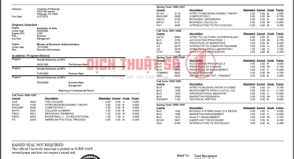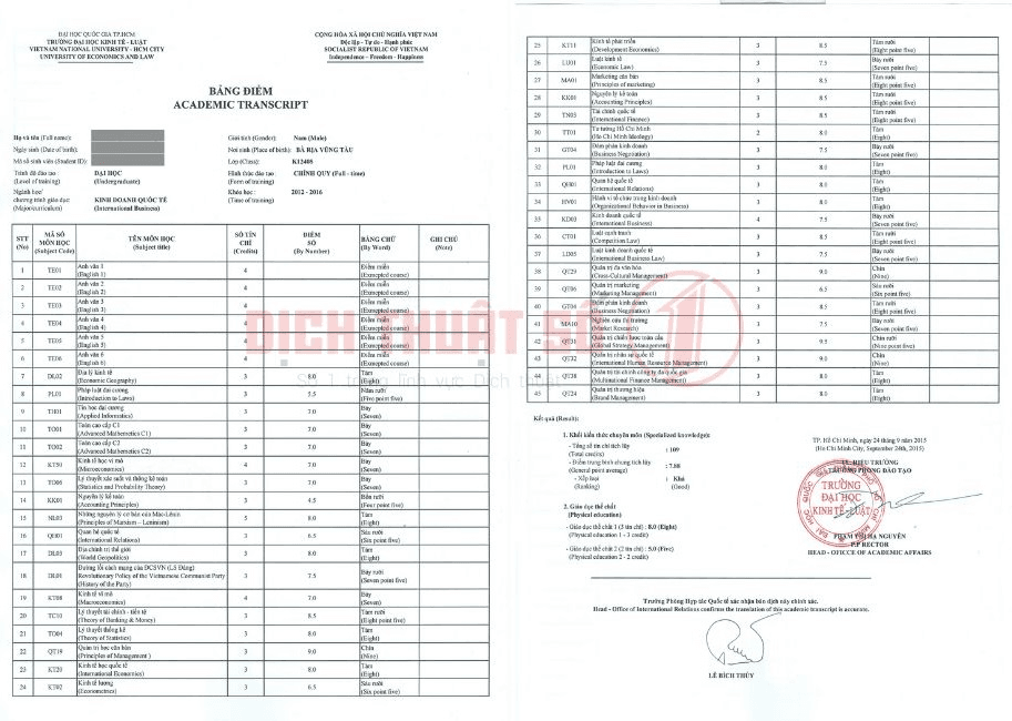 Một mẫu dịch bảng điểm đại học dịch sang tiếng Anh chuẩn quốc tế giúp: