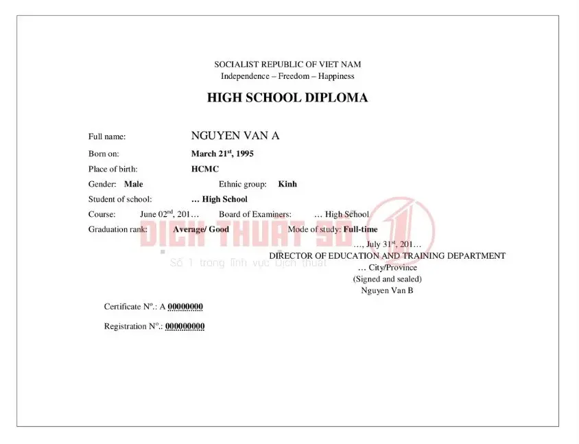 Mẫu dịch bằng tốt nghiệp cấp 3 giúp minh họa cách trình bày bản dịch chuẩn xác, có thể dùng tham khảo khi làm hồ sơ du học hoặc xét tuyển quốc tế.