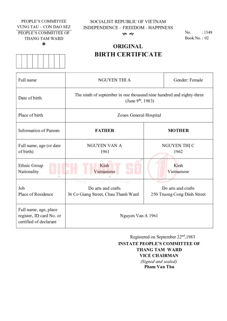 Dịch Thuật Công Chứng Số 1 là lựa chọn tin cậy cho nhu cầu dịch thuật công chứng giấy khai sinh. Với đội ngũ dịch giả chuyên nghiệp và hệ thống quản lý dịch vụ nghiêm ngặt, chúng tôi đảm bảo cung cấp bản dịch chính xác, hợp pháp và giao nhanh đúng hẹn.
