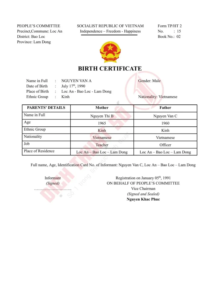 Bản dịch thuật giấy khai sinh sang tiếng Anh Form TP/HT2 những năm 90s mang ý nghĩa đặc biệt bởi đây là mẫu biểu đã được sử dụng phổ biến trong giai đoạn trước khi hệ thống hộ tịch được cải cách và ban hành các mẫu mới.