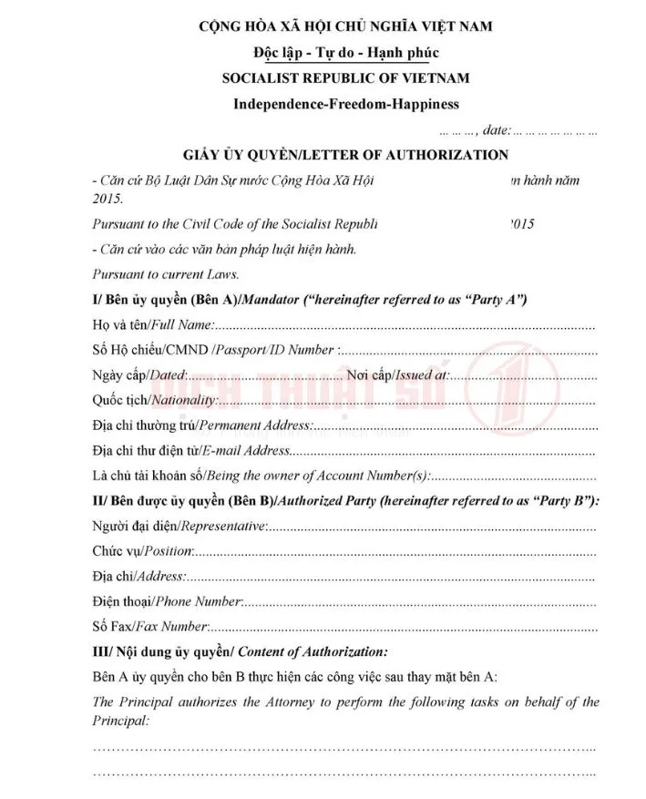 - Tên tài liệu: GIẤY ỦY QUYỀN / LETTER OF AUTHORIZATION